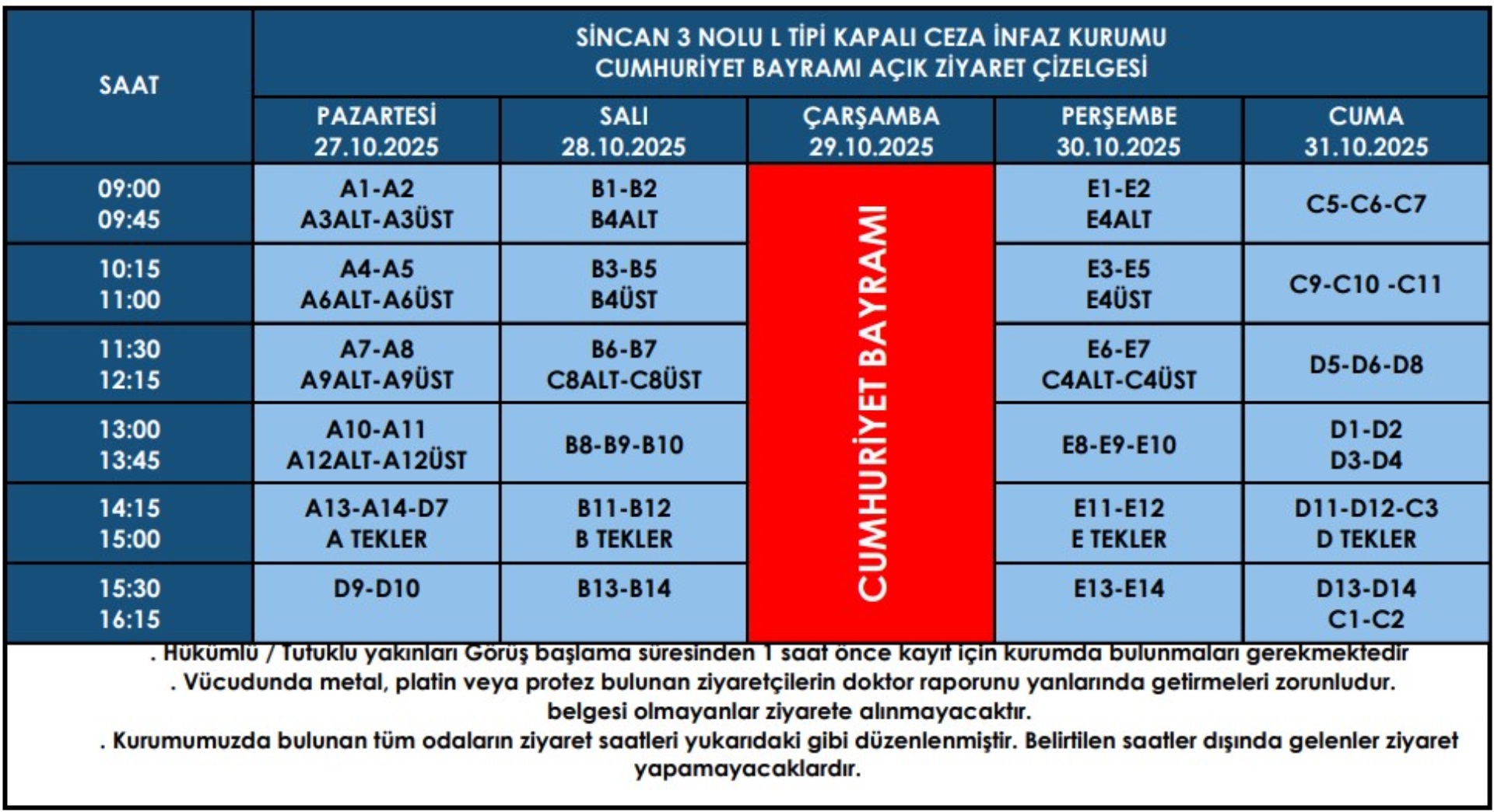 - 21 EkimSİNCAN 3 NOLU L TİPİ KAPALI CEZA İNFAZ KURUMU29 EKİM CUMHURİYET BAYRAMI AÇIK ZİYARET ÇİZELGESİ 2025