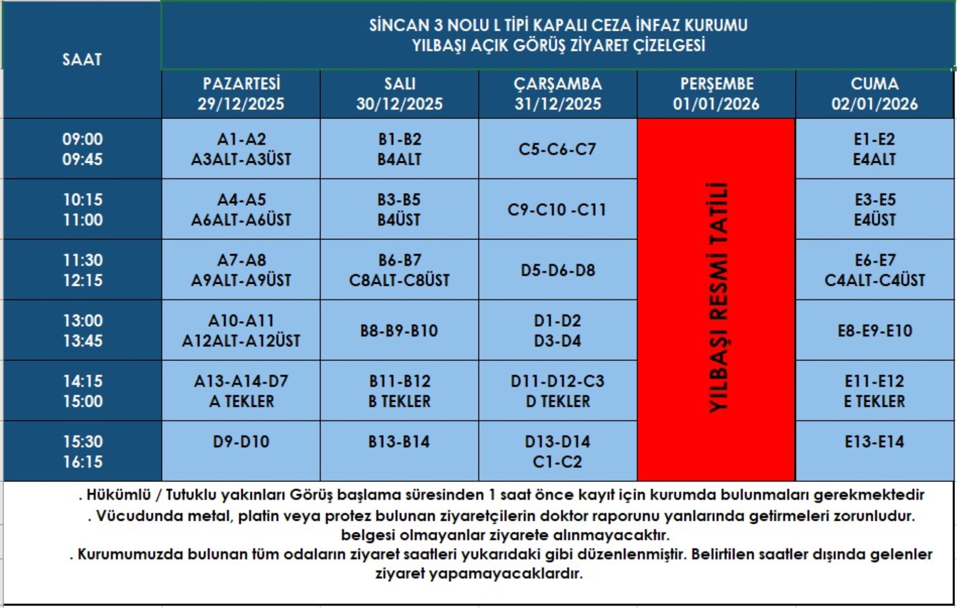 - 24 AralıkSİNCAN 3 NOLU L TİPİ KAPALI CEZA İNFAZ KURUMU2026 YILBAŞI AÇIK GÖRÜŞ ÇİZELGESİ