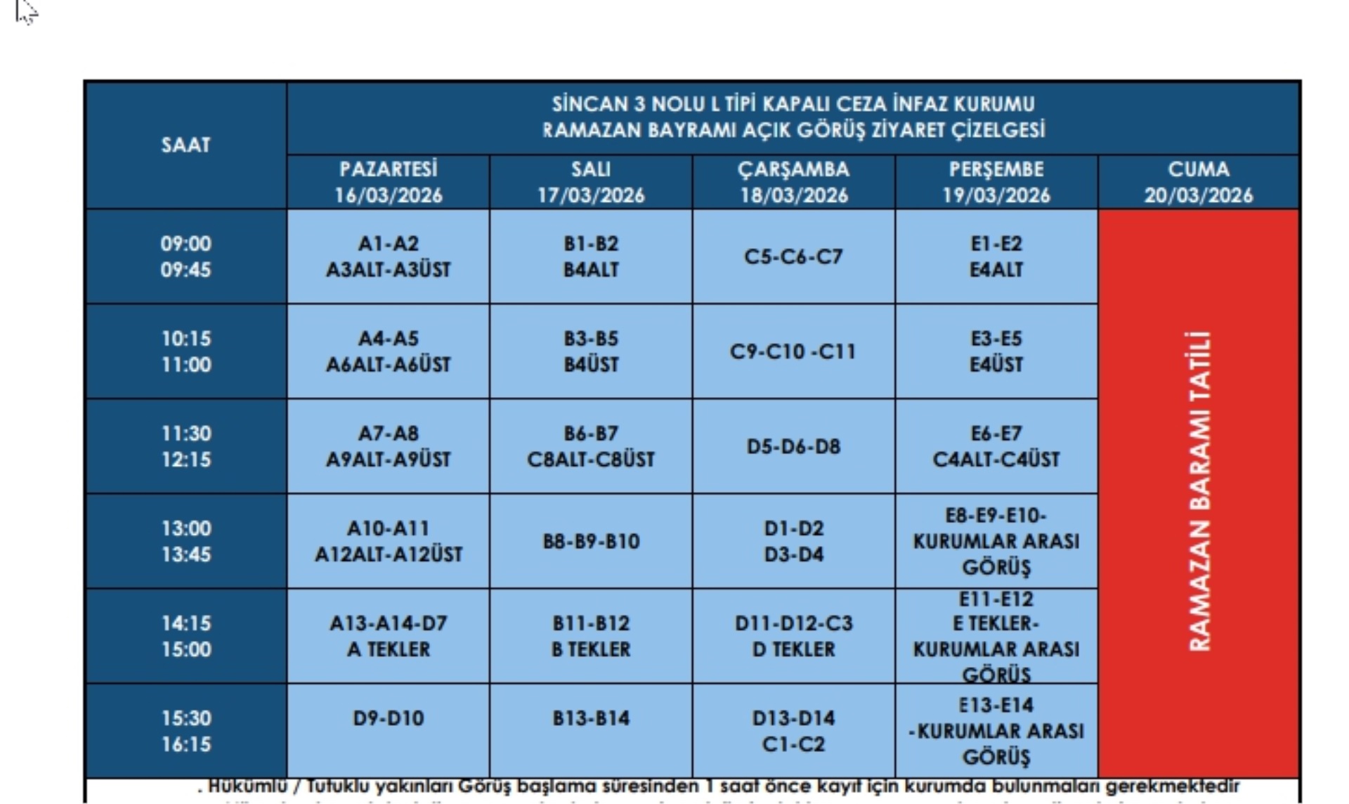 - 16 MartSİNCAN 3 NOLU L TİPİ KAPALI CEZA İNFAZ KURUMURAMAZAN BAYRAMI AÇIK GÖRÜŞ SAATLERİ